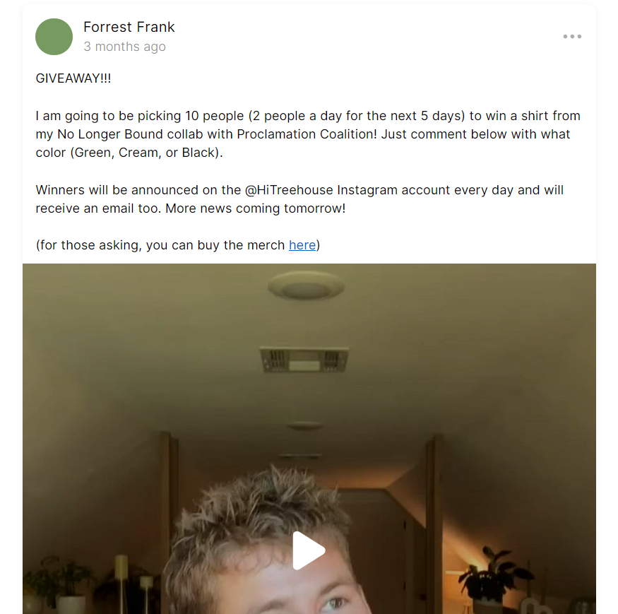 We know that if you are a smaller artist starting out, you may not have merch to offer or think you have anything to give away – but don’t forget about your time! You can giveaway a 5 minute zoom call with a fan! Or giveaway a month/year membership to your community! Both don’t cost you any money, but show that you want to give back.