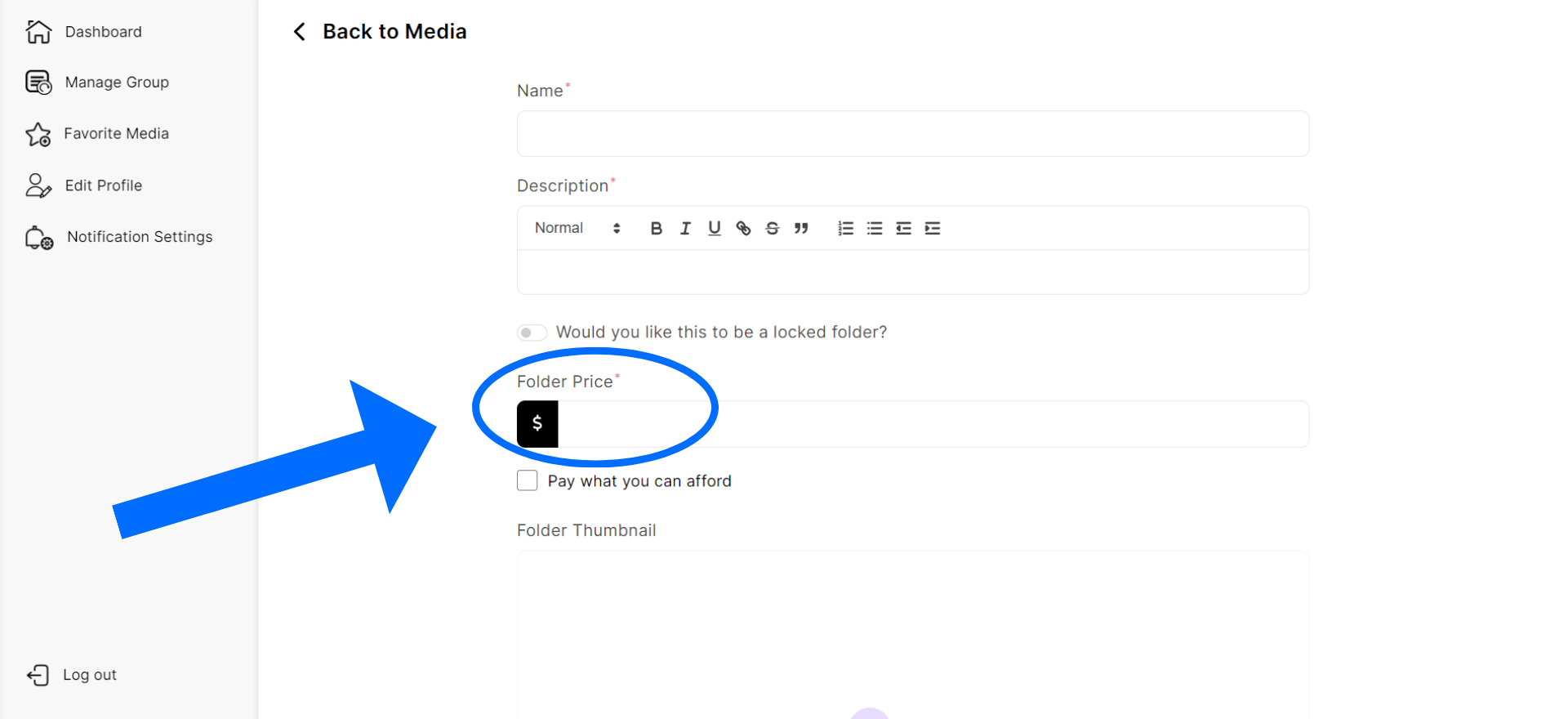 2(b) One Time Purchase – this means ALL members (free or paid) have to pay a price that you set to access the folder. This is great to sell digital products like 1-1 zoom calls, cameo-style videos, and more! Just leave the locked folder grey, check the box next to “Pay what you can afford” and put the minimum price in the Folder Price that someone can pay to have access (must be at least $3).