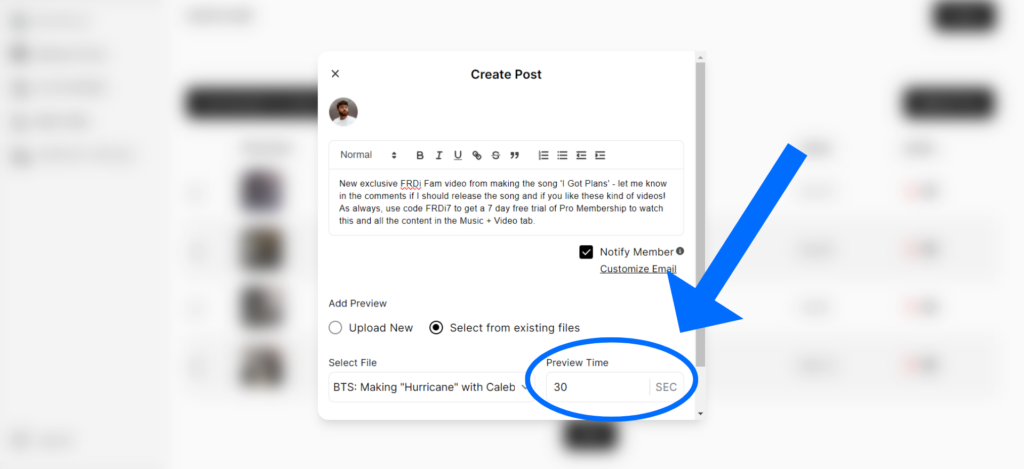 2(b). You can choose to preview one of the files in the media folder by choosing “Select from existing files”. Then choose the file. And how many seconds you want free members to preview (starts at 0 seconds and goes up to 60 seconds).