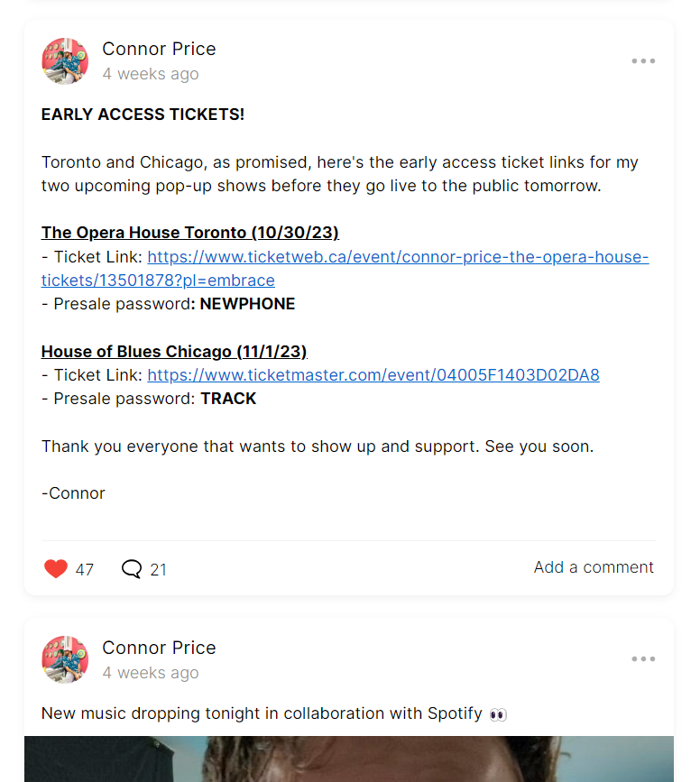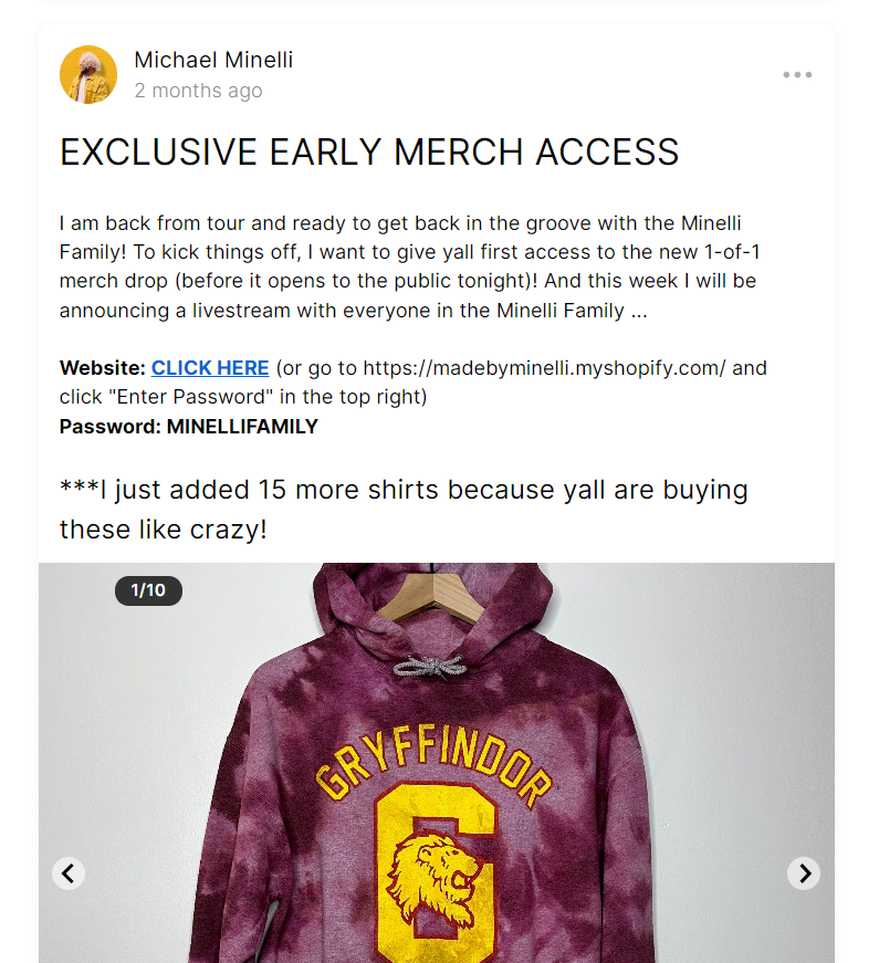 Simple rule: If you are going to charge money for something (such as merch), give first access to ALL members (free included) – you don’t lose any money but the free fans feel special by getting first dibs. This works especially well for a merch drop or tickets to a show/tour. If you aren’t going to charge money for the thing you are promoting (such as a song or video), give a snippet to free members but only give it to paid members. This works especially well for singles/albums/music videos!
