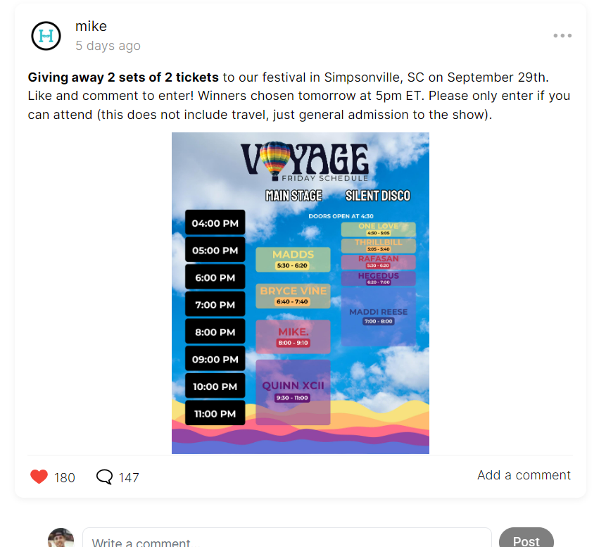 For bigger artists, we have people giving away stuff every week. Mike. gives back $1,000/week to his community! Nic D does a giveaway every Friday! Other artists do a giveaway once a month!