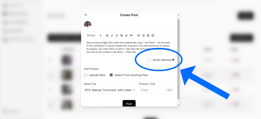 2(a). Type the text you want for the post. If it is a locked/paid folder, you can give a preview to free members. You can choose to upload a custom media file as the preview (you have to if it is an audio file/folder).
