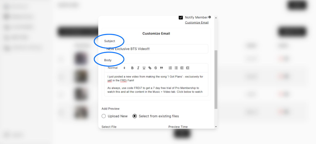 2(b). You can choose to preview one of the files in the media folder by choosing “Select from existing files”. Then choose the file. And how many seconds you want free members to preview (starts at 0 seconds and goes up to 60 seconds).