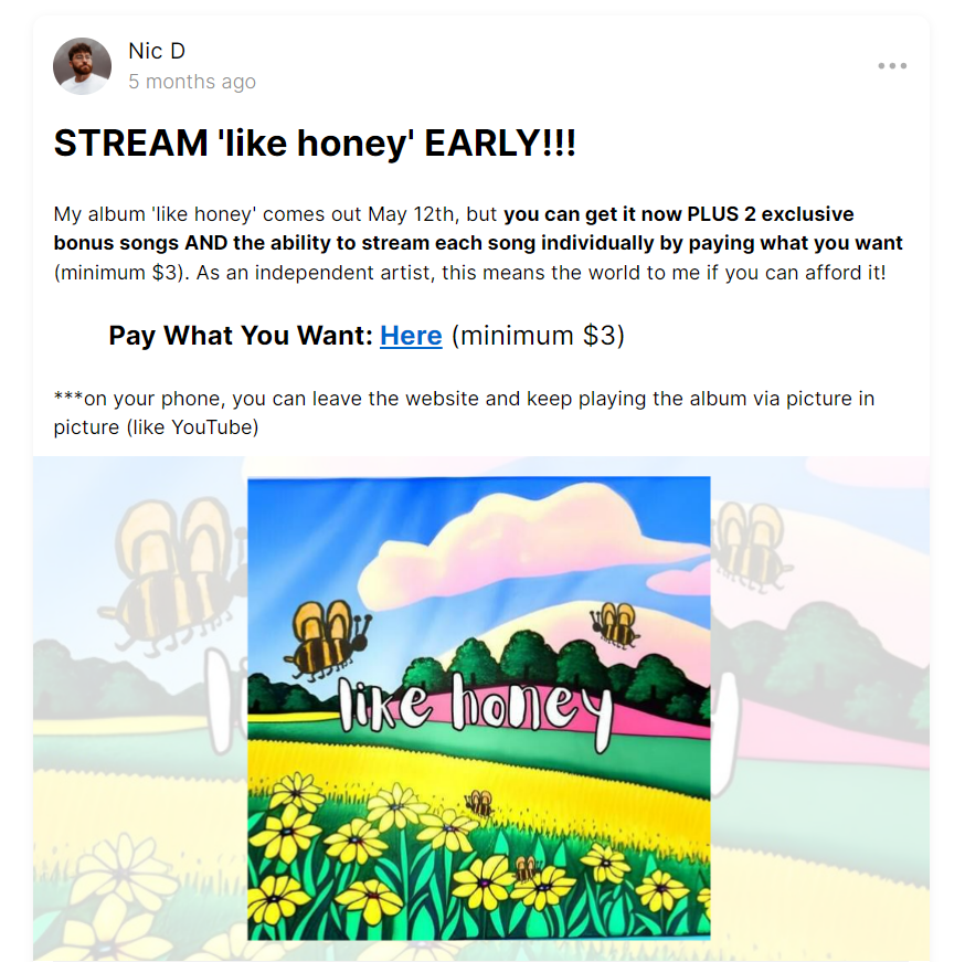 Do you have an album coming out? Why not offer it to your fans early for whatever they want to pay! While you promote your album, you can let your fans know that if they want to listen to it early they can do so by just paying what they want.